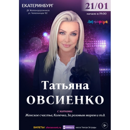 Татьяна Овсиенко — популярная эстрадная певица, заслуженная артистка России, обладательница премии Золотой Граммофон, постоянная участница фестивалей Песня года, Легенды Ретро ФМ. Дебют Татьяны состоялся в легендарной группе Мираж в конце 80-х годов. С 1991 года начала сольную карьеру, став одной из самых известных и любимых певиц Росси и всего СНГ. Ее хиты «Капитан», «Женское счастье», «Колечко», «Дальнобойщик», «За розовым морем» и многие другие вошли в золотой фонд российской популярной музыки. Каждое концертное выступление Татьяны Овсиенко неизменно дарит публике заряд положительных эмоций и встречу с любимыми песнями.